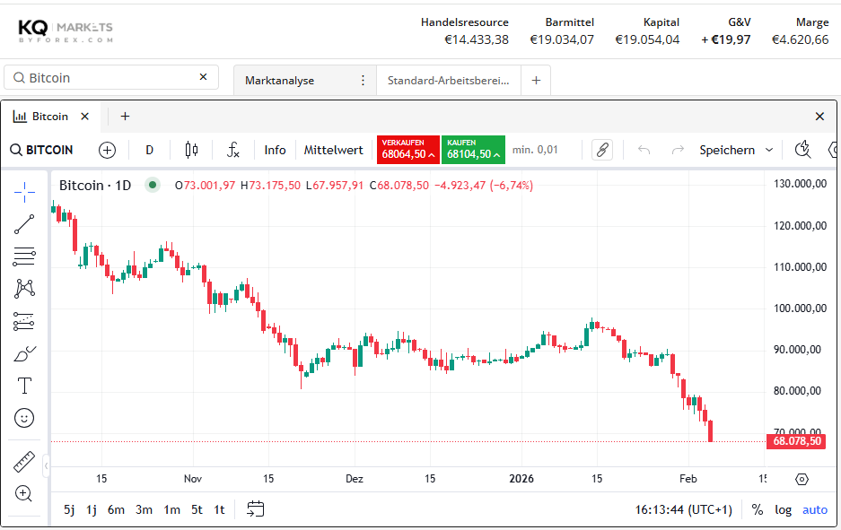 Die wichtigste Kryptowährung der Welt, der Bitcoin, durchläuft derzeit eine Phase massiver Korrekturen. Nachdem die Notierungen im Nachgang des US-Wahlsiegs von Donald Trump Ende 2024 steil nach oben schossen und Rekordmarken von bis zu 126.000 Dollar erreichten, ist die Stimmung nun gekippt. Jüngst rutschte der Kurs unter die psychologisch wichtige Marke von 70.000 Dollar – der tiefste Stand seit November 2024. Damit hat der Coin fast die Hälfte seines Allzeithochs eingebüßt.
